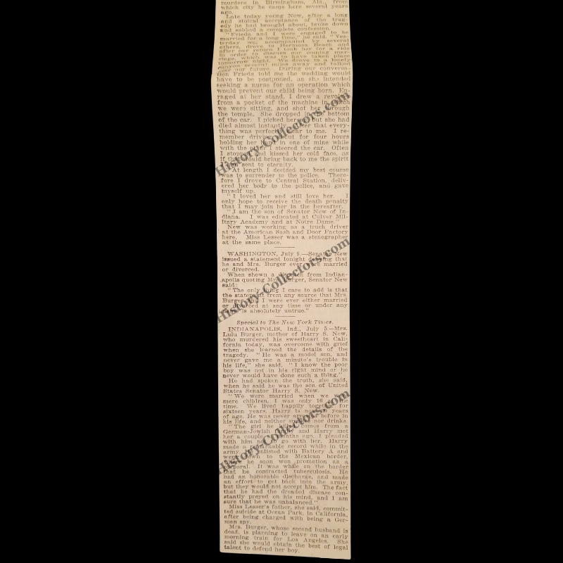 Antique Original 1919 Print Clipping Covering A High-Profile Los Angeles Murder Case Involving Harry S. New, Age 20, Of Glendale, California, Who Voluntarily Surrendered To Police On July 5, 1919. The Article Reports That New Entered Police Headquarters And Informed Detectives That A Dead Woman Was In His Automobile, Stating His Intention To Confess To Murder. Police Accompanied Him To The Vehicle, Where They Discovered The Body Of Frieda J. Lesser, Age 21, Who Had Died From A Gunshot Wound To The Head - Progressive Era - Ready For Framing