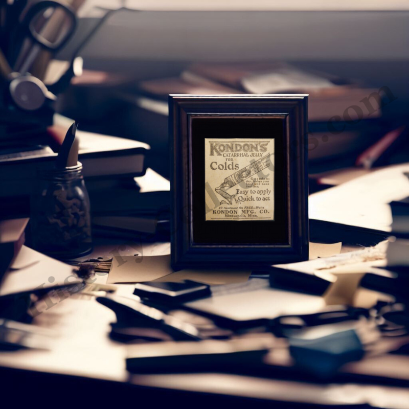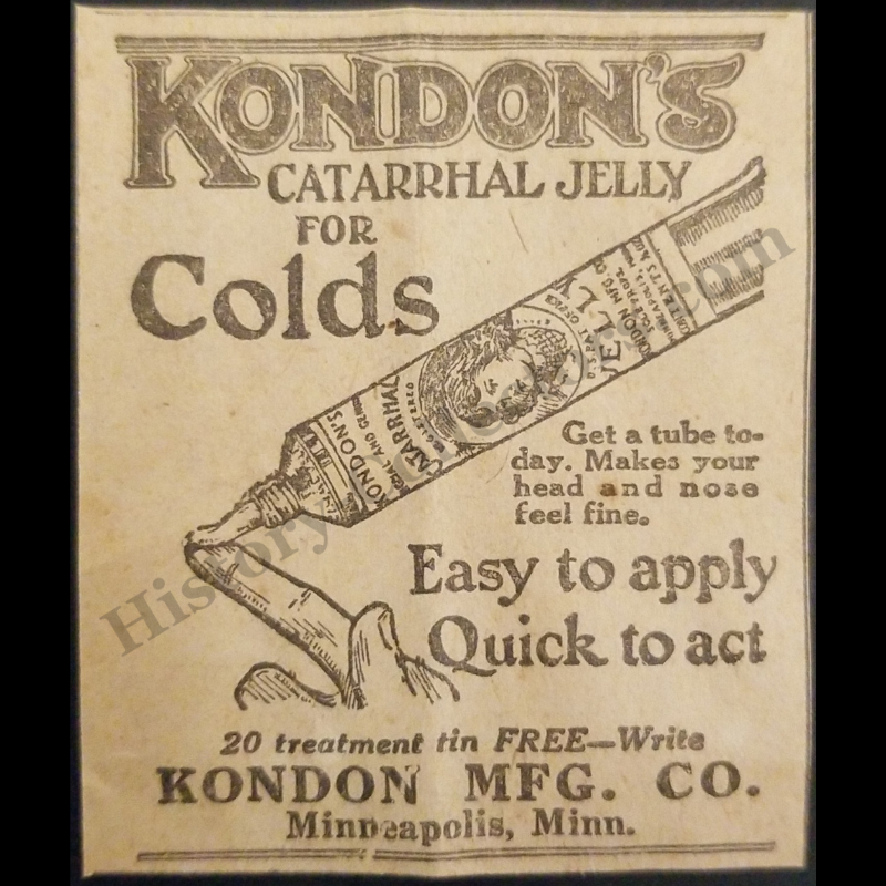 This 1921 Print Advertisement Promotes Kondon’s Catarrhal Jelly, A Nasal Treatment Produced By Kondon Manufacturing Company Of Minneapolis, Minnesota. Marketed For Relief From Colds And Nasal Congestion, The Product Was Applied Inside The Nose And Advertised As "Easy To Apply" And "Quick To Act." The Term "Catarrh" Was Commonly Used In Early 20th Century Medicine To Describe Excessive Nasal Mucus Or Inflammation. The Ad Includes A Mail-In Offer For A Free Tin Containing 20 Treatments. This Reflects A Period Before Federal Regulations Required Scientific Validation Of Medical Claims, Prior To The 1938 Food, Drug, And Cosmetic Act.
