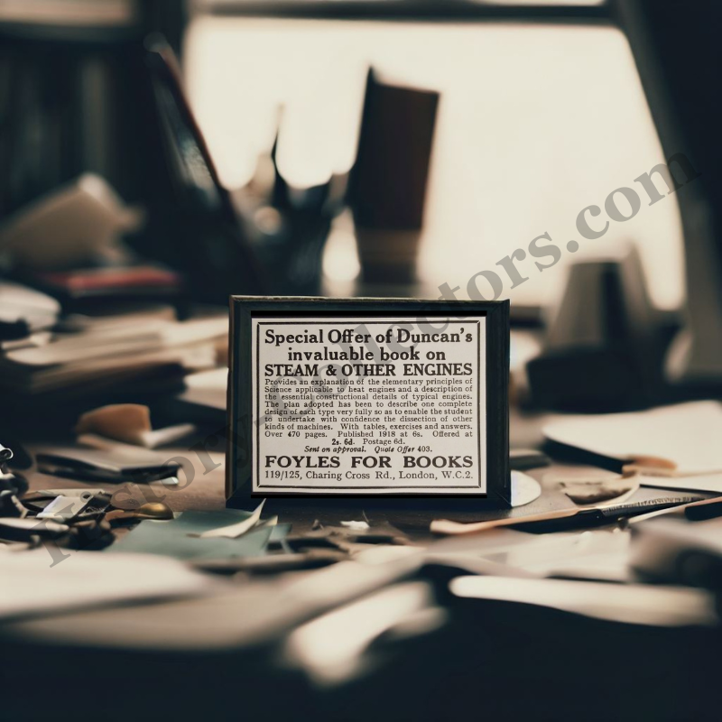 1929 Advertisement Promotes Duncan’s Book On Steam And Other Engines, Originally Published In 1918. The Book Explains Elementary Scientific Principles Related To Heat Engines And Provides Detailed Descriptions Of Engine Construction. It Includes Complete Design Examples, Tables, Exercises, And Answers Across Over 470 Pages. The Book Was Offered At A Reduced Price Of 2 Shillings And 6 Pence, With An Additional 6 Pence For Postage. The Advertisement Was Issued By Foyles For Books, A Prominent London Bookseller Located At 119/125 Charing Cross Road, And Required Customers To Quote Offer 403.
