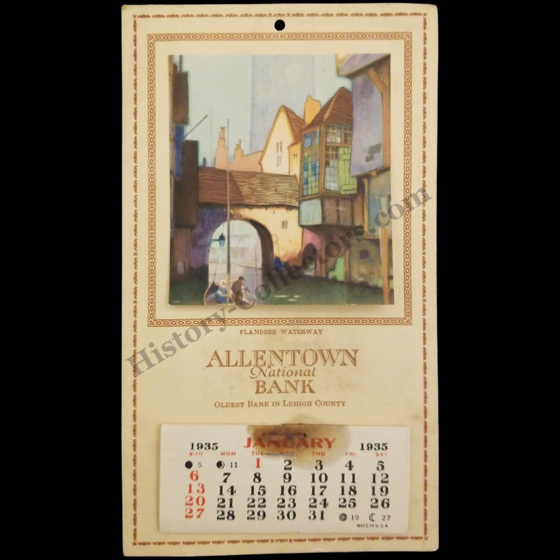 This 1935 Pop-Up Desk Calendar Was Issued By Allentown National Bank, Advertised As The Oldest Bank In Lehigh County, Pennsylvania. The Calendar Includes A Full Set Of Monthly Pages For The Year 1935, With January Displayed On Top. It Features A Printed Color Illustration Titled "Flanders Waterway" And Was Manufactured In The United States, Marked With The Code "19 C 27." Distributed As A Promotional Item, It Reflects Common Banking Practices Of The Early 20th Century, When Businesses Provided Practical Advertising Items To Clients. The Calendar Combines Functional Design With Period Artwork Typical Of The 1930s.